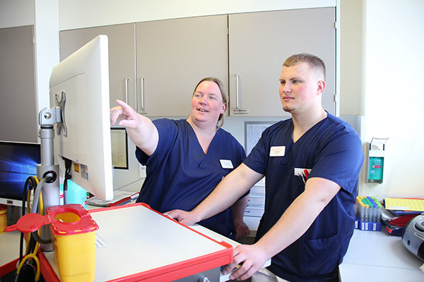 Pro Zimmer gibt es feste Ansprechpartner, die Patienten und die Azubis lernen sich kennen. „So begleiten die Schüler die Patienten und können dort alles selbst machen und sehen“, sagt Pauly. Körperpflege, Ankleidung, Tablettengabe, Ernährung, Verbände anlegen, Infusionsgabe und und und. Die Schüler machen alles selbst, auch Fehler gehören dazu. Damit trotzdem alles gut geht und zu keiner Zeit ein Risiko für die Patienten besteht, sind pro Schicht zwei Pflegefachkräfte mit dabei, außerdem eine freigestellte Praxisanleiterin und Pflegewissenschaftler. Dabei sein dürfen die Schüler aber auch bei Eingriffen wie minimalinvasiven Standimplantationen. „Das ist schon etwas Besonderes für die Schüler.“