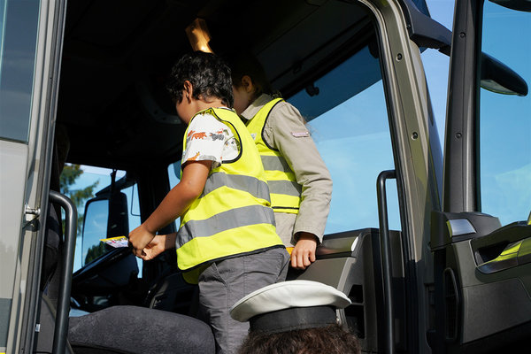 [Linda und Adam (beide 8) durften sogar in das Führerhaus eines Lastwagens klettern, um mit dem Fahrer zu sprechen.]
