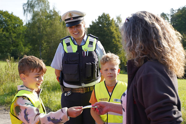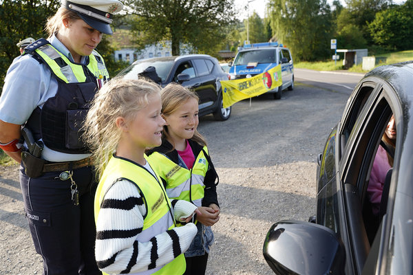 Wenn man von der Polizei aus dem Verkehr gezogen wird, dann kann einem das Herz schon mal in die Hose rutschen. So ist es am Morgen wohl auch dem ein oder anderen Autofahrer in Gummersbach-Wegescheid ergangen, als er an der dortigen Kreuzung herausgewunken worden ist. „Ruhig atmen! Sie haben nichts falsch gemacht!“, riefen die Polizistinnen einigen Fahren zu, ehe sie mit den Hauptakteuren der Aktion zu den gestoppten Fahrzeugen gingen. Ausgestattet mit gelben Warnwesten waren es Kinder, die dann mit den Fahrern sprachen und sie – anlässlich des Schulbeginns – darum gebeten haben, vorsichtig zu fahren.