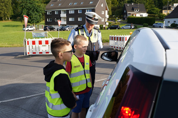 In Wegescheid haben heute 20 Drittklässler der Gemeinschaftsgrundschule Hülsenbusch an der Aktion teilgenommen. Unterstützt wurden sie dabei von Oberkommissarin Daniela Kindel und den Hauptkommissarinnen Ina Beyenburg und Kerstin Schinkovski. Mit dabei waren unter anderem Ole (7) und Alaric (8). Die beiden hatten richtig Spaß bei der Aktion, suchten sich die Autos aus, die ihnen am besten gefielen. Nach zwei BMW sollte es ein weißer Audi werden. Die beiden warteten vergeblich, pickten sich dann aber einen großen Mercedes heraus. „Heute werden viele Kinder eingeschult. Bitte fahren Sie vorsichtig“, sagten sie dem Fahrer. Zur Erinnerung gaben sie ihm dann noch ein kleines Foto von einem Schulkind mit, auf dem steht: „Pass bitte auf mich auf!“