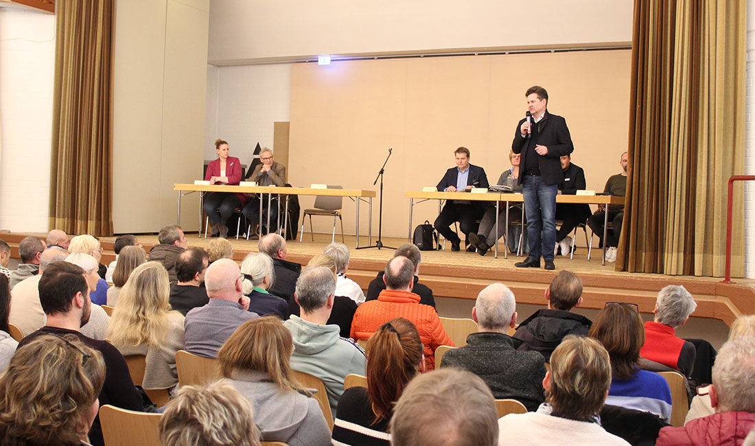Während der Fragerunde erreicht das Mikrofon einen Mann, der sich bereits an der Treppe hoch zum Podium positioniert hatte. Als er das Mikrofon hatte, enterte er die Bühne und setzte zu einer Rede an. Er sprach von „Abfällen der Migration“, von seiner Enttäuschung den Ratsmitgliedern gegenüber. Er verhaspelte sich allerdings schnell in seinen Beschimpfungen, je unruhiger der Saal wurde, und verstummte, bevor man ihm das Mikro hätte wegnehmen müssen. „Nicht in dem Ton“, ermahnte Ulrich Stücker anschließend. „Emotionen sind ok, aber wir wollen bitte weiter vernünftig diskutieren.“ Es blieb bei diesem Vorfall.
