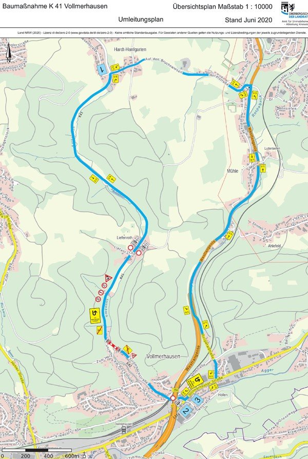 Gummersbach – Aufgrund der Sanierung eines maroden Gewässerdurchlasses in Vollmerhausen ist die K 41 bis voraussichtlich Mitte November nicht befahrbar – Umleitung nach Liefenroth über die Westtangente, Rospe und Hardt-Hanfgarten.