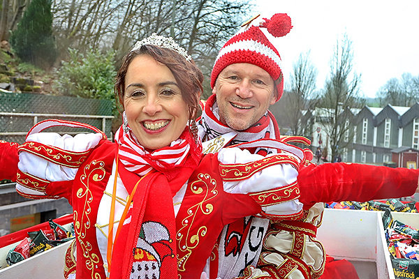Den Schlussakkord im Karnevalszug setzten die Aushängeschilder der KG Rot-Weiß Denklingen. Kinderelferrat, Burgmäuse, Burggarde, die Pänz von der Burg, der Senat und der Elferrat brachten neben dem üblichen Wurfmaterial rund 2.400 Chipsbeutel, 6.000 Haribotütchen, 200 Secco-Dosen und 1.500 frische Berliner vom ortseigenen Bäcker unters Volk. Krönender Abschluss des abwechslungsreichen Defilées war der Prinzenwagen. Mit den Royals Prinz Rüdiger I. und seiner Prinzessin Caroline, die Mitmenschen aller Generationen im Laufe der Session mit mehr als 100 begeisternden Auftritten beschenkten.