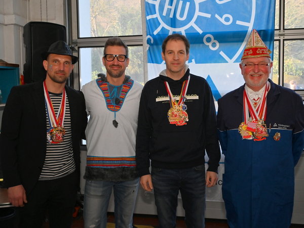 [Andre Klein (v.li.), Björn Neumann und Sebastian Zibuschka vom TÜV sorgten gemeinsam mit Gastprüfer Paul Remmel für die jecke Abnahme.]