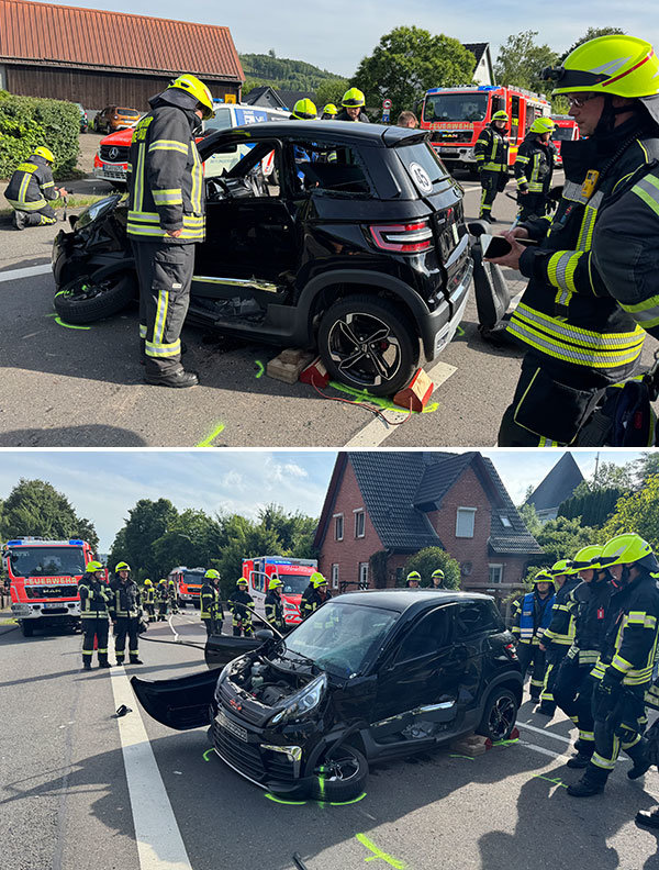 Die 15-Jährige wurde dabei in dem Fahrzeug eingeschlossen und musste durch die Feuerwehr - vor Ort waren die Einheiten Dörspetal und Bergneustadt - befreit werden. Sie hatte offenbar großes Glück bei der Kollision, denn Microcars haben so gut wie keine Knautschzone. Die Jugendliche erlitt nach Angaben der Polizei leichten Verletzungen und wurde ins Krankenhaus Gummersbach gebracht.