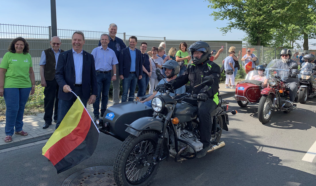 Davon, wie viel Freude es den „Mitfahrern“ machte, im Seitenwagen, auf dem Quad oder Trike unterwegs zu sein, konnte sich auch Landrat Jochen Hagt überzeugen. Er hatte nicht nur die Schirmherrschaft über die Veranstaltung übernommen, sondern gab auch den Startschuss. „Unglaublich, was hier mit ganz viel Herzblut und ehrenamtlichen Engagement auf die Beine gestellt wurde“, staunte er angesichts der Biker, die vor der HBW-Zentrale in einer langen Reihe Aufstellung genommen hatten und ein imposantes Bild boten.