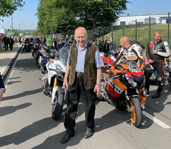 „Bei dieser Ausfahrt geht es darum, anderen Menschen Freude zu bereiten – natürlich musste ich dabei sein!“, erklärte Ekki seine Teilnahme an der Oberbergischen Ausfahrt und sprach damit vielen teilnehmenden Bikern, darunter Herbert Simon, ehemaliger Deutscher Meister im Motocross und Deutscher Meister im Seitenwagen, aus dem Herzen.