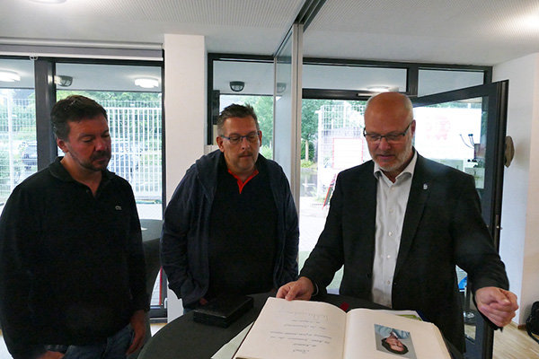[Björn Lange (v.l.), Michael Moll und Heribert Berster stöbern durch das Goldene Buch.]