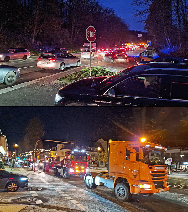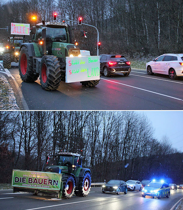 [Fotos: Michael Gauger --- Stillstand herrschte in Engelskirchen sowohl auf dem Zubringer Richtung Autobahn als auch auf der Hauptstraße im Ortszentrum, wo die Protestierenden mit ihren Traktoren und Lkw einen langsam fahrenden Konvoi bildeten.]