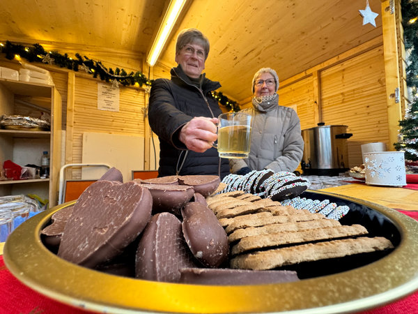 [Glühwein und Plätzchen boten die Frauen der katholischen Kirchengemeinde.]