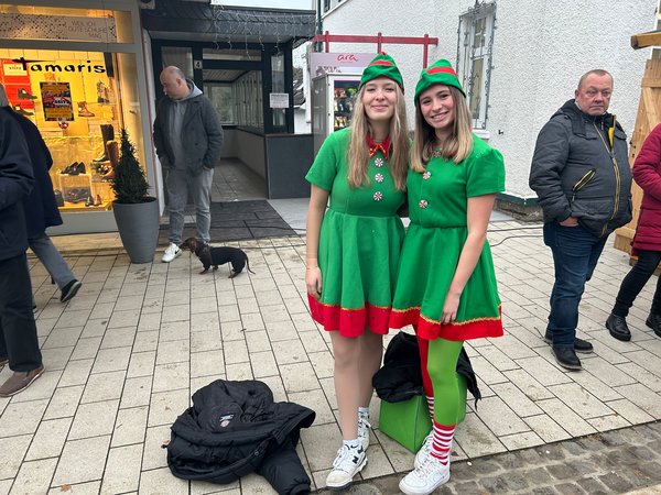 [Julia (links) und Michelle, Eiskunstläuferinnen vom TuS Wiehl, verkleideten sich als Helferinnen des Weihnachtsmanns und verteilten Schokolade an die kleinen Besucher.]