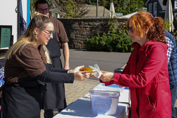 Kinderschuhe, Mützen, Pulswärmer, Kissen und Wolle, gefertigt aus den Haaren ihrer vier Alpakas bot die Neu-Morsbacherin Anja Worringer-Bommert feil, am Stand der Wiehler Genussmanufaktur Königskind wurde der Gourmetgaumen von Aromen der unterschiedlichsten Pestos, Chutneys, Senfe und Fruchtaufstriche gestreichelt. In Begleitung ihres feixenden Familienbesuchs aus Gera traute sich die Nümbrechterin Antje Reinhard an die Verkostung von „Schwarzen Walnüssen“, einer Delikatesse, die zu Käse, Wild oder Desserts gereicht wird. Doch bediente das üppige Speisenangebot mit Pommes, Zwiebelkuchen, Waffeln, Deftigem vom Grill, Apfelpfannkuchen oder Ofenkartoffeln jede auch noch so ausgefallene kulinarische Vorliebe.