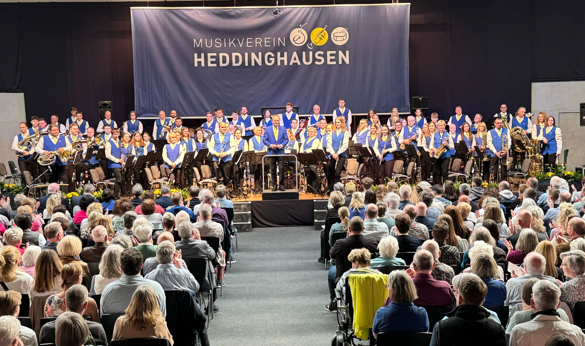 Unter dem Beifall von 1.000 Zuschauern zogen gestern 79 Mitglieder des Musikvereins Heddinghausen auf die Bühne der Nümbrechter Arena ein. Der Vorsitzende des Vereins, Arwid Strang, freute sich neben den zahlreich erschienenen Besuchern auch Politiker aus Kommunal-, Kreis- und Landesebene und die Vorstandsvorsitzenden von Sparkasse und Volksbank zu begrüßen. Bei der Musikauswahl habe man Wert auf nachdenkliche, fröhliche und auch besinnliche Musikstücke gelegt.