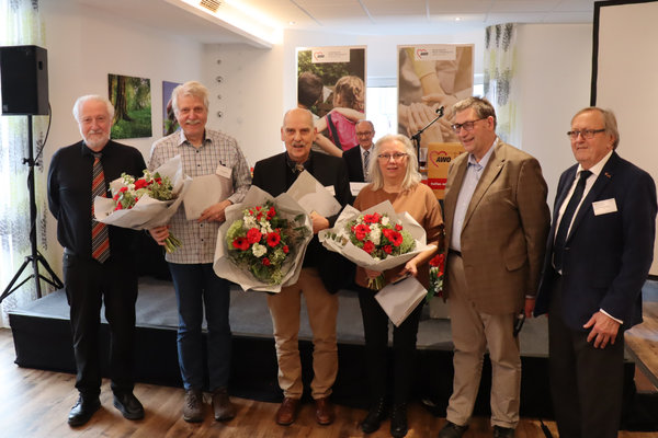 Elke Oberbüscher und Rainer Salisch Chromow (3.v.li.) erhielten für ihr langjähriges Engagement im bisherigen ehrenamtlichen Kreisvorstand die Verdienstmedaille des AWO-Bundesverbands. Christian Weiss (2.v.li.) erhielt als ausscheidendes Mitglied des bisherigen Vorstands die Ehrenmedaille für besonderes ehrenamtliches Engagement des Kreisverbandes. Die Auszeichnungen überreichten Axel Heiner Dabitz, Präsidiumsvorsitzender des AWO-Bezirksverbands Mittelrhein (li.) sowie Ralph Kühr (2.v.re.) und Hans Mettig (re.) vom neu gewählten Präsidium. Für die 50-jährige Mitgliedschaft im AWO-Ortsverein Engelskirchen-Overath wurden außerdem Wolfgang und Elke Oberbüscher geehrt.