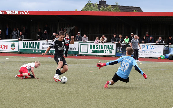 „Finale daheim“ für die D-Junioren des SSV Marienheide und die Gastgeber hatten zumindest zaghafte Hoffnungen, dem FV Wiehl ein Beinchen zu stellen, schließlich hatte man in der Sonderstaffel hinter dem heutigen Gegner den zweiten Platz erreicht. Doch die FV-Fußballer erwischten einen Blitzstart. Es waren keine drei Minuten gespielt, da hatte Darian Simara schon zweimal eingenetzt. „Das hat uns natürlich in die Karten gespielt“, so Wiehls Trainer Jörn Neugebauer über den frühen Doppelpack des Außenstürmers, der von nichts und niemandem zu stoppen war und sich am Ende sieben Mal in die Torschützenliste eintrug. Dabei hätte er locker auf eine zweistellige Zahl an Treffern kommen können, scheiterte allerdings mehrfach an SSV-Torwart Gabriel Iosob bzw. am Aluminium.