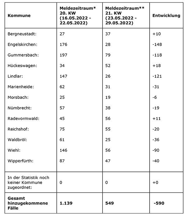 ** Die Daten entsprechen dem Stand, den das Gesundheitsamt des Oberbergischen Kreises am heutigen Morgen für den vorliegenden Wochenbericht ermittelte.