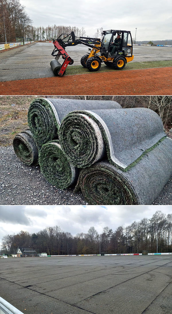 Inzwischen sind die Arbeiten in vollem Gange. Im März begann die Firma KRB im Auftrag des Generalunternehmers Polytan damit, die bisherige Kunstrasendecke mit einem Spezialgerät abzutragen. Dieser Vorgang ist bereits abgeschlossen worden. Etwa 250 Rollen mit dem alten Material wurden von sieben Sattelschleppern wegtransportiert und werden nun zum Teil anderweitig verwendet. So gingen 22 Rollen an den TuS Elsenroth, der damit auf seinem Sportgelände eine Schotterfläche abdecken will. Auch die Gemeinde Nümbrecht sicherte sich zehn Rollen.