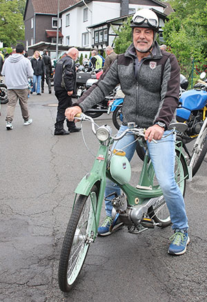 Dieter Kleber aus Reichshof-Eichholz zum Beispiel brachte seine NSU Quickly N, Baujahr 1962, mit: „Die ist von meinem Vater und lag 30 Jahre bei mir im Keller in Einzelteilen. Und irgendwann sagte meine Frau: ‚Du wolltest die doch immer mal zusammenbauen.‘ Das habe ich vor sieben, acht Jahren gemacht – und der Papa fährt noch immer damit.“