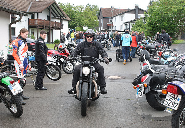 Besitzer Jakob aus Untereschbach erklärte stolz: „Es ist kein Motorrad, es ist auch kein Auto – es ist ein Tricycle, also eine Mischung aus beidem. Damals waren das die ‚Knallzigarren‘, die unterwegs waren. Selbst die Bentleys hatten Angst vor den Dreirädern.“ Trotz leichten Regens zog das traditionelle Treffen am Dorfhaus in der Prombacher Straße am Donnerstagvormittag über 200 Motorradfahrer an. „Wir hatten sogar einen Herrn hier, der wird dieses Jahr 90 – und er war bei jedem Treffen mit seiner eigenen Maschine dabei“, sagte Dominik Schlegel, Vorsitzender des Ortsvereins.