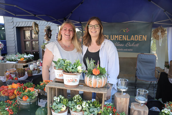 Neben dem Kinderschminken der Sparkasse erfreute sich auch das Kürbisvasen herstellen für Kinder als Besuchermagnet. Am Blumenladen „Ninas Bukett“ durften sich die Kinder einen Kürbis aussuchen und nach Herzenslust mit allerlei Herbstblumen und Herbstfrüchten gestalten. Daniel (5 Jahre) und seine siebenjährige Schwester Hannah fanden das „cool. Gesichter schnitzen können wir nicht gut, das hier schon.“