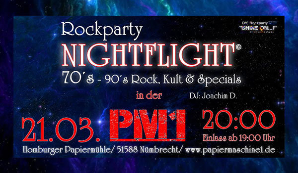 NüMBRECHT Rockparty in der Homburger Papiermühle TEILEN Red; 11.03.2026, 11:29 Uhr Nümbrecht - "Nightflight" am 21. März. Weitere Informationen hier. WERBUNG