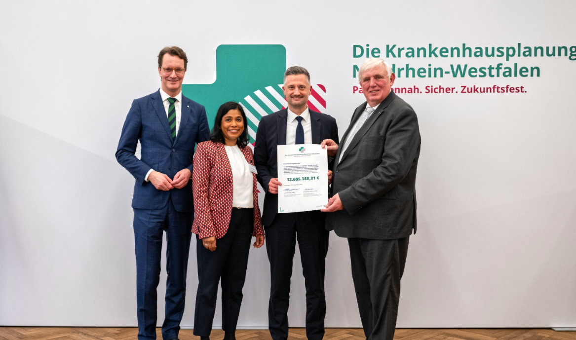NRW-Ministerpräsident Hendrik Wüst und der Minister für Arbeit, Gesundheit und Soziales des Landes Nordrhein-Westfalen, Karl-Josef Laumann, haben dem Geschäftsführer der Klinikum Oberberg GmbH, Sascha Klein, sowie der Chefärztin der Klinik für Kinder- und Jugendpsychiatrie, -psychotherapie und -psychosomatik, Thayalini Boll, einen Förderbescheid in Höhe von 12,6 Millionen Euro übergeben. Die Übergabe fand im Rahmen der Umsetzung der Krankenhausplanung Nordrhein-Westfalen in der Staatskanzlei des Landes Nordrhein-Westfalen statt.