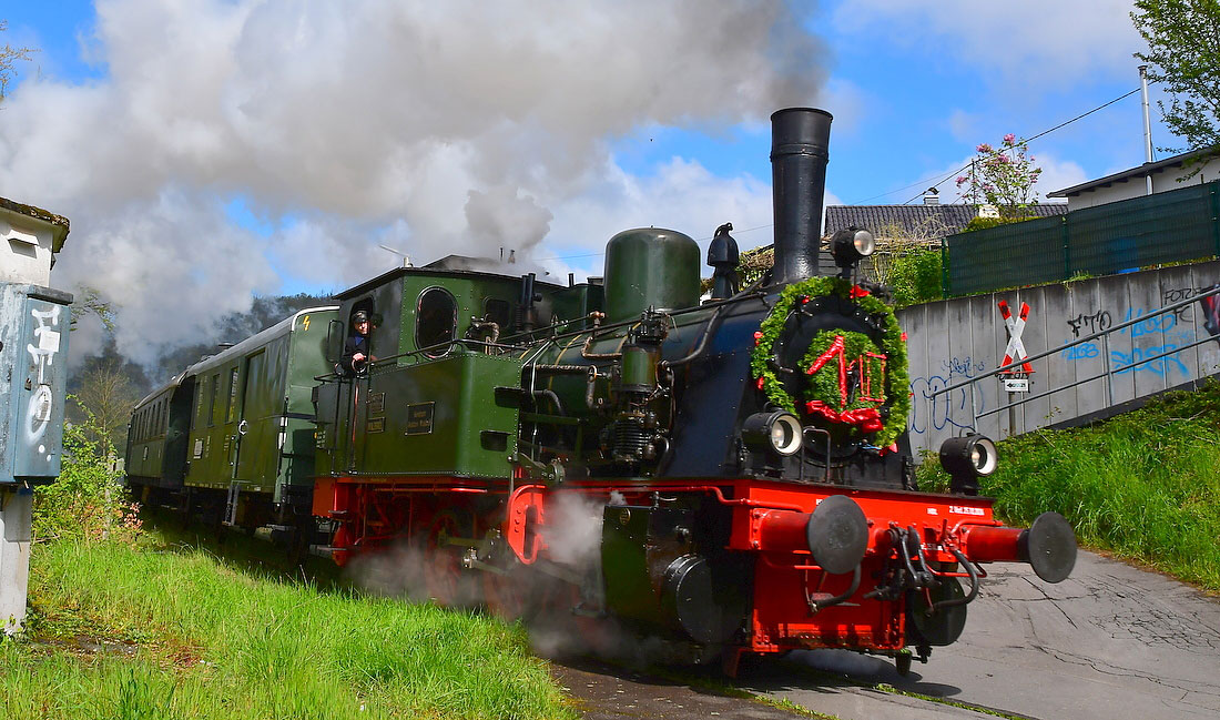 Die Rauchkammertür der Dampflok vorne dem stolzen Alter entsprechend festlich geschmückt, wartete die „Waldbröl“ am Sonntagmorgen im Ringlokschuppen auf ihren großen Auftritt. Bereits am Vortag war der Kessel behutsam angefeuert worden, der aufsteigende Rauch über dem Lokschuppen verriet jedoch den Aufenthaltsort der rüstigen Dame. Sehr zur Freude der vielen Fahrgäste jeglichen Alters, die sich sehr zeitig zur ersten Fahrt am Vormittag eingefunden hatten. Begeisterung kam auf, als die dampfbetriebene Lok in Richtung der großen Drehscheibe schnaufte. Beide Fahrten an diesem Tag endeten in Wiehl, bevor es nach dem etwa 45-minütigem Wasserfassen und Umsetzen der Lok wieder Richtung Heimat ging.