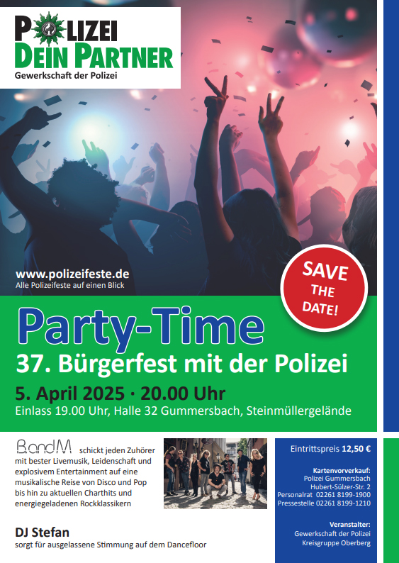 Am Samstag, 5. April, veranstaltet die Gewerkschaft der Polizei (Kreisgruppe Oberberg) ihr 37. Bürgerfest in der Halle 32 in Gummersbach. Einlass ist um 19 Uhr, die Feier beginnt eine Stunde später. Das Live-Programm wird gestaltet von der "Band M" und DJ Stefan. Karten sind für 12,50 Euro erhältlich an der Anmeldung des Polizeidienstgebäudes in Gummersbach (Hubert-Sülzer-Straße 2) sowie an der Abendkasse.