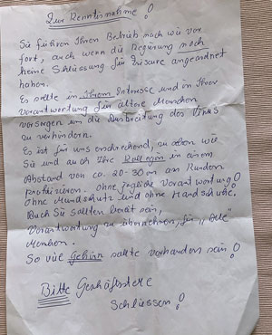 Die Friseurin Alessia Trautwein betreibt ihr Geschäft mit ihrer Angestellten Julia Linker in Bergneustadt-Hackenberg und war am gestrigen Morgen geschockt, als sie einen anonymen Brief von ihrer Ladentür fand. Darin wird sie unter anderem aufgefordert, ihr Ladenlokal sofort zu schließen. Bei der Polizei hat sie bereits Anzeige erstattet. Die alleinerziehende Mutter von einem schulpflichtigen Kind würde die Türen ihres Geschäfts am liebsten sofort schließen, derzeit sind ihr aber aus wirtschaftlichen Gründen aber die Hände gebunden.