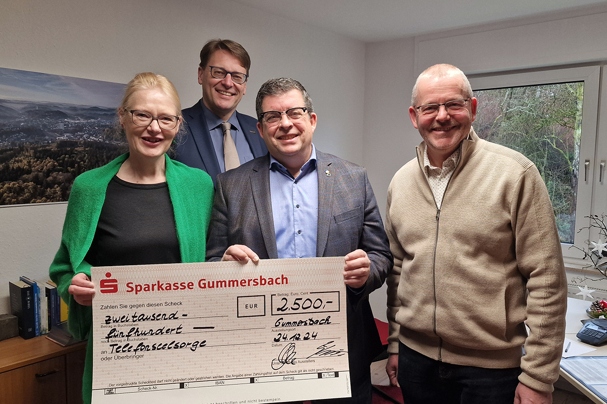 Es ist aber auch eine finanzielle Frage: Jeder Ausbildungskurs kostet die TelefonSeelsorge 15.000 Euro. Umso größer war die Freude über das diesjährige Weihnachtsgeschenk, das Helmenstein im Gepäck hatte: Um der Telefonseelsorge Oberberg finanziell unter die Arme zu greifen, hatte der Vorsitzende des Verwaltungsrats bei seinem letzten Besuch einen besonders großen Scheck dabei: 2.500 Euro gab es aus den Mitteln der Sparkasse und der Bürgerstiftung.