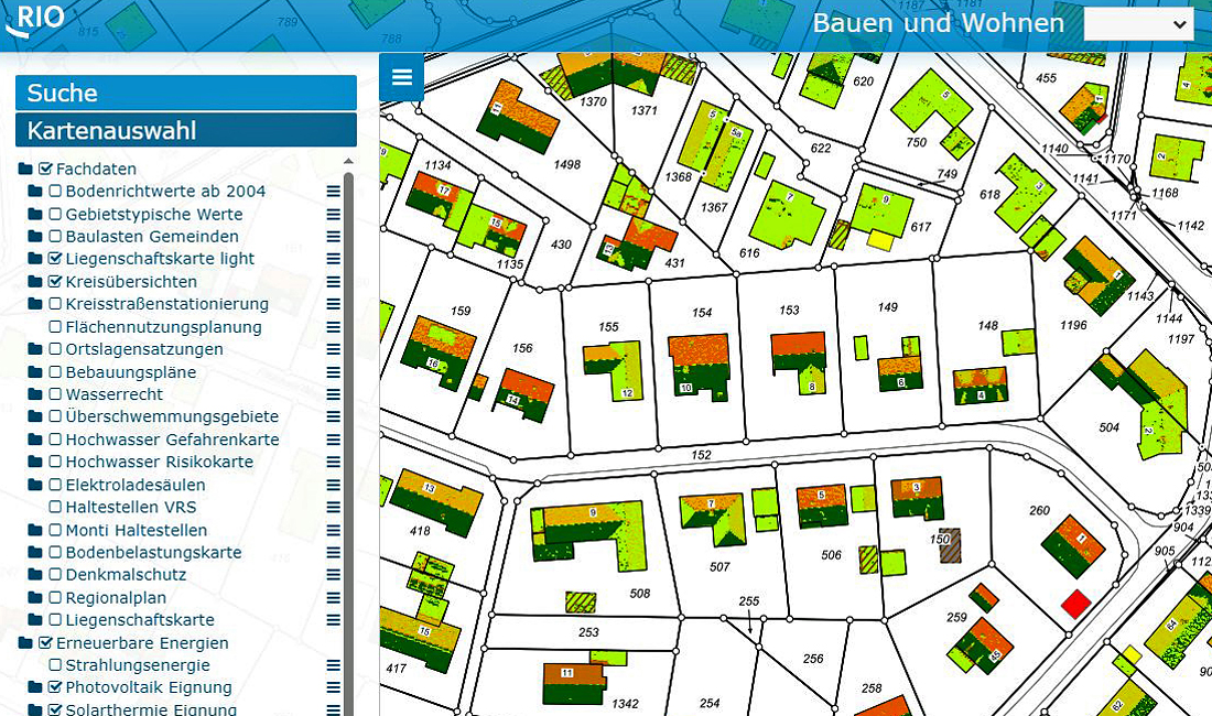Das neue Solarkataster des Oberbergischen Kreises ist online. Mit diesem Angebot können Bürger kostenlos herausfinden, ob sich das eigene Dach für eine Photovoltaikanlage eignet. Das Solarkataster ist im Rauminformationssystem Oberberg (RIO) ab sofort verfügbar. Die Karte zeigt, in acht Stufen unterteilt, die mögliche Eignung, die sich aus der Dachausrichtung und -neigung ergibt. Durch farbliche Markierungen und Prognosewerte können die Daten für jedes Gebäude abgerufen werden.