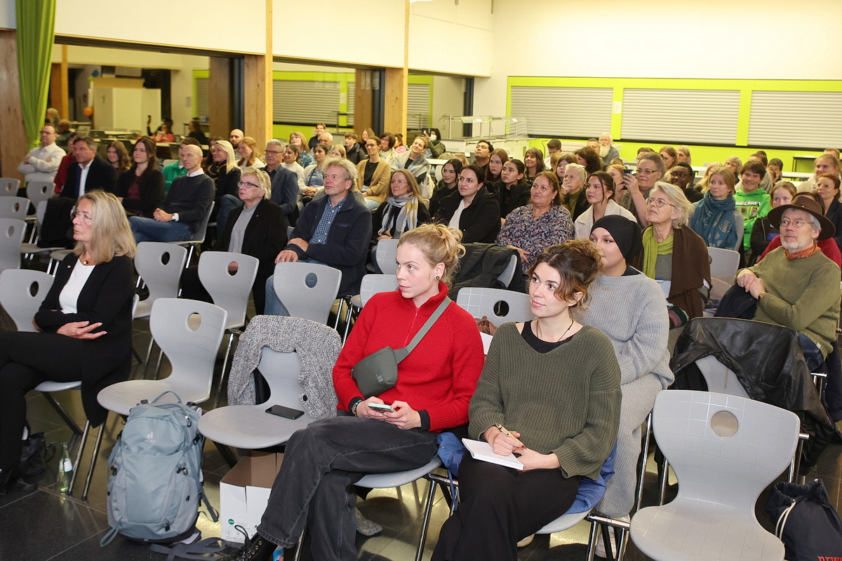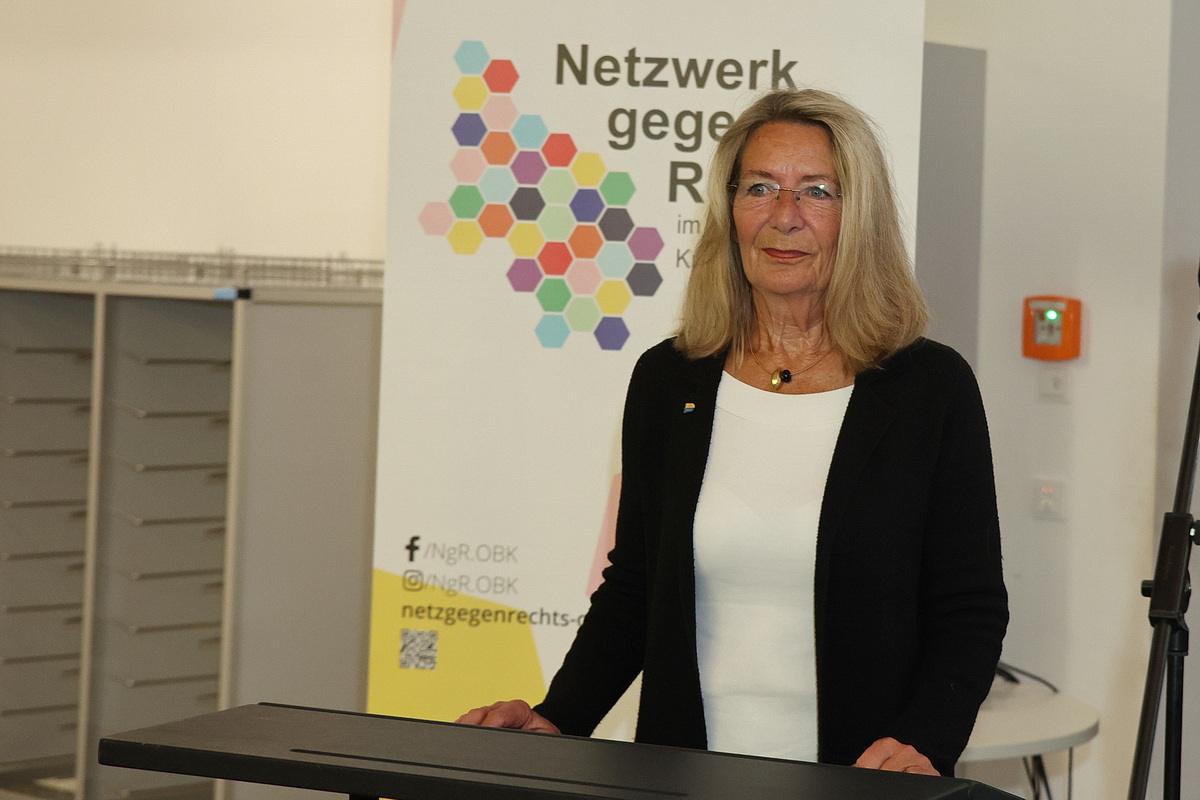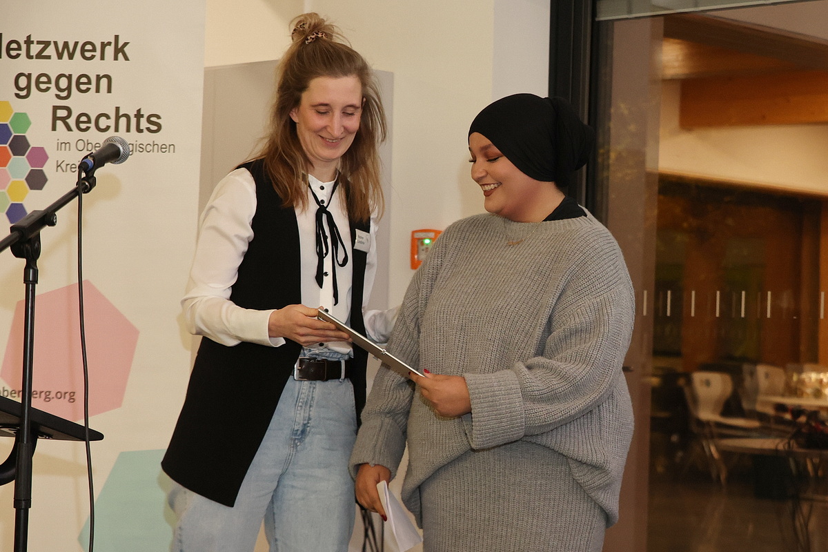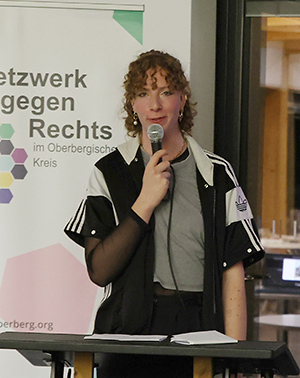 In ihrem Grußwort lobte Helga Auerswald, stellvertretende Bürgermeisterin von Gummersbach, das Format des Jugendkulturpreises, das sich speziell an Heranwachsende wende und zur kritischen Beschäftigung mit den politischen Phrasen und Plakatierungen rechter Parteien auffordere. „Jeder muss sich in seinem persönlichen Umfeld für die Werte der Demokratie einsetzen“, forderte sie, sich jederzeit und allerorten menschenverachtendem, rechten Gedankengut entgegenzustellen. In ihren Liedbeiträgen warb Sängerin Rebekka, als Siegerin des Jugendkulturpreises 2023, um Toleranz und Gerechtigkeit, positionierte sich gegen Diskriminierung und gedankliche Vereinnahmung. Mit dynamischer Poetry-Performance warnte die Wipperfürthter Wortkünstlerin Jana Goller ihre Zuhörer vor Einseitigkeit, verkürzten Wahrnehmungen und Vorverurteilungen von Menschen mit alternativen Lebensentwürfen.