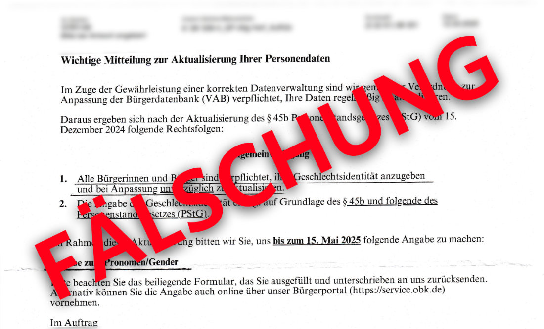 Als Absender des Schreibens wird das "Landratsamt Gummersbach" genannt. Diese Behörde gibt es nicht. Im konkreten Fall wird das Anliegen als "Wichtige Mitteilung zur Aktualisierung Ihrer Personendaten" bezeichnet und mit einer "Allgemeinverfügung" begründet. Demnach seien "alle Bürgerinnen und Bürger [...] verpflichtet, ihre Geschlechtsidentität anzugeben und bei Anpassung unverzüglich zu aktualisieren." Auf diesen Hinweis folgt ein Verweis auf das "Personenstandgesetz".