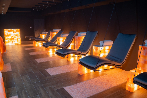 In der neuen Salzlounge mit Sole-Inhalation erleben die Gäste die zahlreichen positiven Wirkungen von Salz auf Körper und Geist. Bequeme Schwebeliegen, große Salzmonolithe, angenehme Lichteffekte und sanfte Musik sorgen für ein ganz besonderes Entspannungserlebnis.