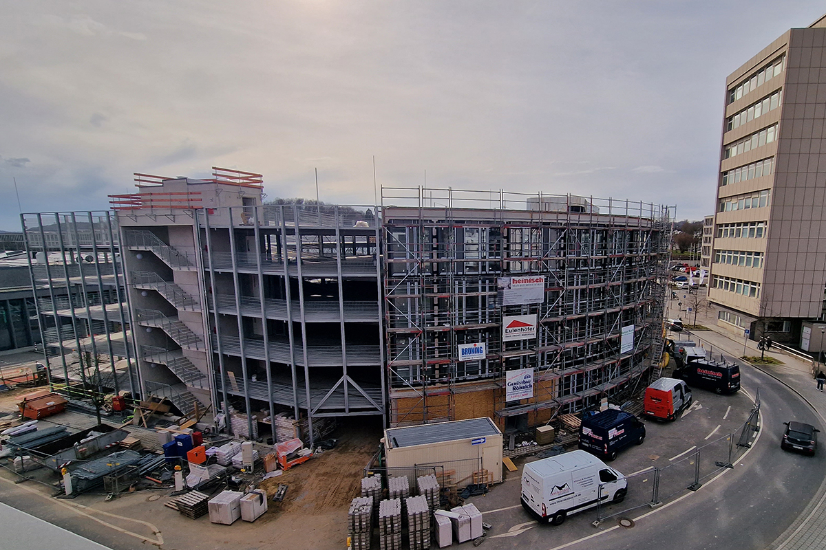 Noch bevölkern Bauarbeiter den hochmodernen Neubau und das angrenzende Parkhaus, die momentan im Norden des Gummersbacher Steinmüllergeländes an der Steinmüllerallee 12 entstehen. Fristgerecht, voraussichtlich zum 31. Oktober dieses Jahres, sollen die Arbeiten der Firma Ferchau abgeschlossen sein und das Gebäude an den neuen Mieter übergeben werden.