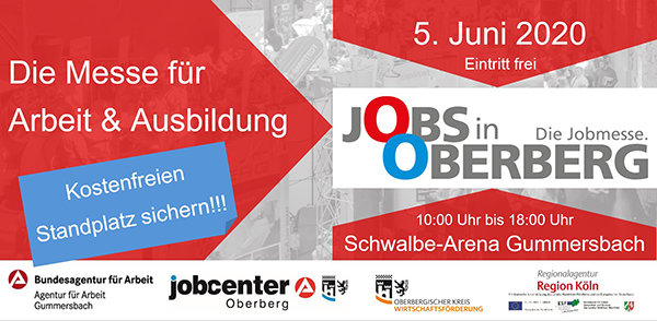 Arbeitgeber aus dem gesamten Oberbergischen werben am 5. Juni 2020 um Arbeitnehmer und Auszubildende. Die Gummersbacher Schwalbe-Arena wird zur Ausstellungsfläche für die größte Jobmesse im Kreis. Zielgruppen sind potentielle Arbeitnehmer, Auszubildende sowie Weiterbildungsinteressierte. Bei freiem Eintritt wird Besuchern ein umfangreiches Rahmenprogramm mit Bewerbungsmappen-Check, kostenfreiem Shooting von Bewerbungsfotos und verschiedenen Vorträgen geboten.