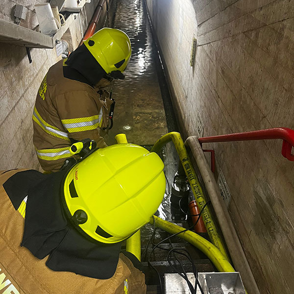 Nur kurze Zeit nach dem Einsatz der LG Holte wurden die Kameradinnen und Kameraden des LZ Stadt um 3:29 Uhr geweckt. Mit dem Stichwort „Wasserschaden“ ging es zur Pumpstation des Beverstaudamms nach Reinshagensbever. Dort schafften die fest verbauten Pumpen es nicht mehr, das eindringende Sickerwasser weg zu fördern. Mit insgesamt vier Tauchpumpen wurde gut 1,5 Stunden lang Wasser aus dem Damm gepumpt, bis der Wasserstand wieder so niedrig war, dass die fest verbauten Pumpen ausreichend waren.