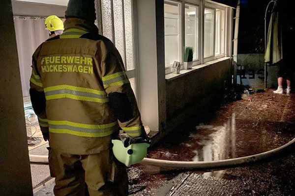 In der Nacht auf den ersten Weihnachtstag klingelten dann um 1:16 Uhr die Meldeempfänger der Löschgruppe Holte. In dem Keller einer Wohnung auf einem Firmengelände bei Kobeshofen sollte es durch den Dauerregen zu einem größeren Wassereintritt gekommen sein. Die zunächst nur alarmierte „Erkundung“ bestätigte sich vor Ort.
