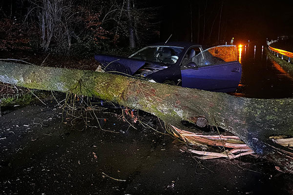 Eine durchaus beispielhafte Unwetternacht erlebten die Einsatzkräfte der Feuerwehr Hückeswagen. Mitten in der Heiligabend-Bescherung wurde der LZ Stadt um 19:18 Uhr auf die K 1 bei Erlensterz alarmiert. Dort stürzte unmittelbar vor einem fahrenden Auto ein großer Baum auf die Straße, wie die Feuerwehr mitteilt. Der Fahrer konnte einen Zusammenstoß nicht mehr vermeiden. Bei Ankunft der Feuerwehr wurde der Fahrer bereits vom ebenfalls alarmierten Rettungsdienst versorgt. Er musste zur weiteren Behandlung ins Krankenhaus.