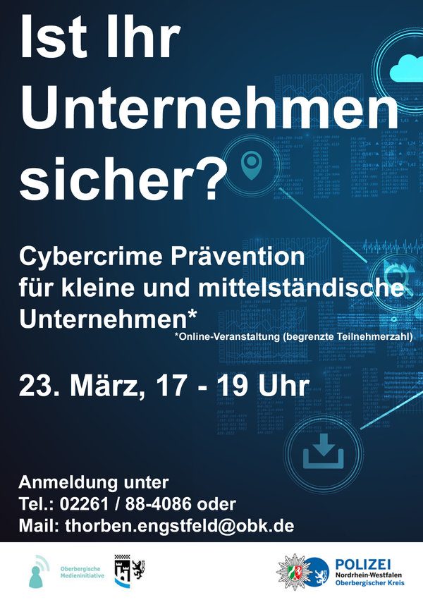 Ransomware, Datenverschlüsselung, das Ausspähen von Firmendaten sind unter anderem Thema einer kostenlosen Online-Veranstaltung der Polizei in Kooperation mit der Oberbergischen Medieninitiative am Mittwoch, 23. März, von 17 bis 19 Uhr. Referent ist Kriminalhauptkommissar Dirk Beerhenke vom Polizeipräsidium Köln.