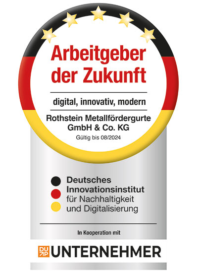 Die Rothstein Metallfördergurte GmbH & Co. KG freut sich darüber im Oktober 2023 die Auszeichnung als „Arbeitgeber der Zukunft“ erhalten zu haben. Das Deutsche Innovationsinstitut für Nachhaltigkeit und Digitalisierung (DIND) zeichnet mit dem Siegel „Arbeitgeber der Zukunft“ innovative Unternehmen aus, die durch moderne Führung und eine klare Digitalisierungsstrategie bestechen.