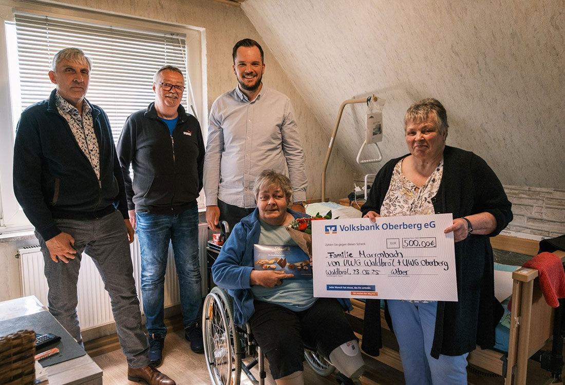 Zum Abschluss der Wochen der Pflege hat die UWG Oberberg gemeinsam mit Vertreterinnen und Vertretern der UWG Waldbröl den beiden Schwestern Michaela und Petra Marrenbach 500 Euro als finanzielle Unterstützung überreicht. Petra ist laut Mitteilung nach einer schweren Erkrankung auf den Rollstuhl angewiesen, ihre Schwester Michaela, selbst gesundheitlich stark beeinträchtigt, übernimmt dennoch die Pflege. Die beiden leben in Waldbröl und stehen laut UWG stellvertretend für viele Angehörige, die Tag für Tag unter großem persönlichen Einsatz Pflege leisten - oft ohne ausreichende Unterstützung durch das System. Mit der Aktion möchte die UWG auf die prekäre Situation vieler pflegender Angehöriger aufmerksam machen.