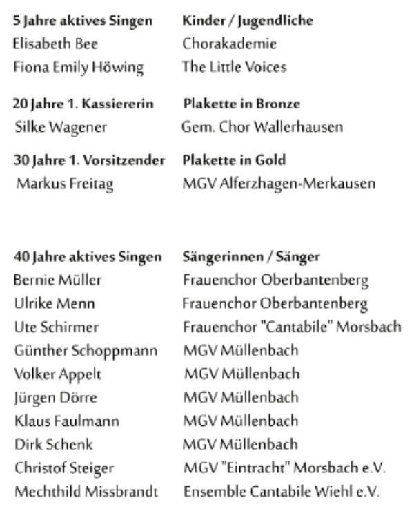 Morsbachs Bürgermeister Jörg Bukowski gratulierte allen Jubilaren und freute sich, dass die Veranstaltung im renovierten Gertrudisheim stattfinden konnte und dort wieder Leben eingekehrt ist. Er sieht Morsbach mit seinen Chören und besonders mit den Meisterchören kulturell gut aufgestellt. Der stellvertretende Landrat Tobias Schneider, bezeichnete die ehrenamtlichen Tätigkeiten von Vereinen und Chören als besonders wichtig für die Gesellschaft.