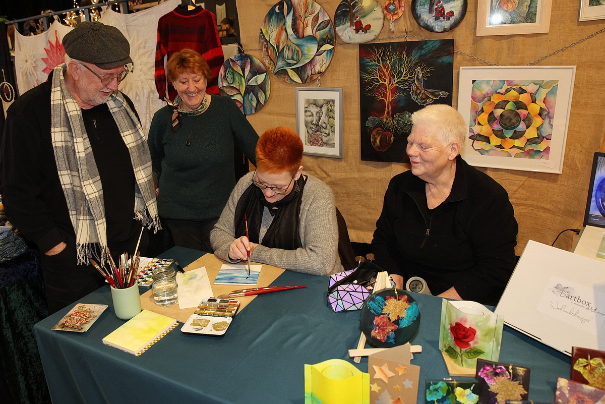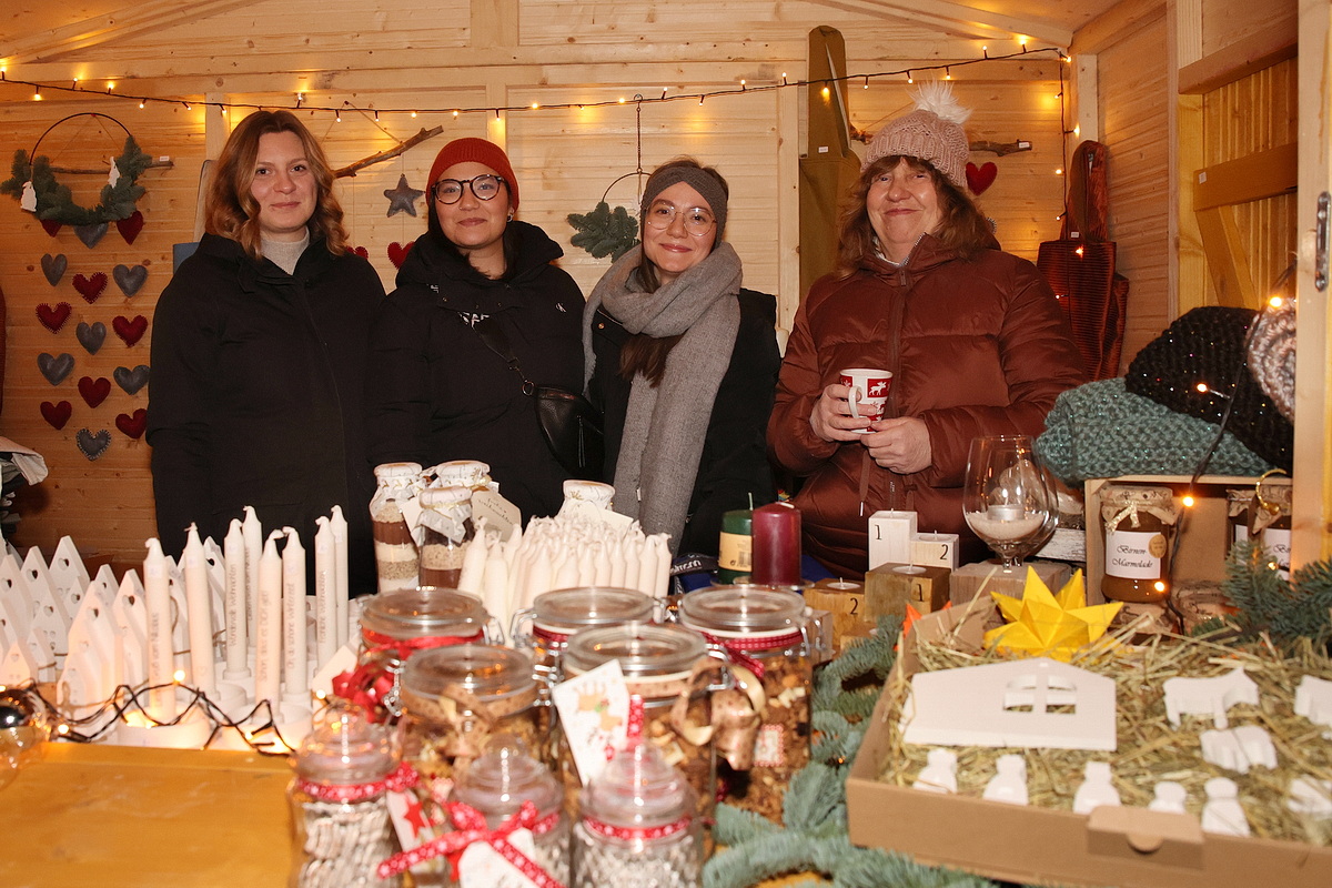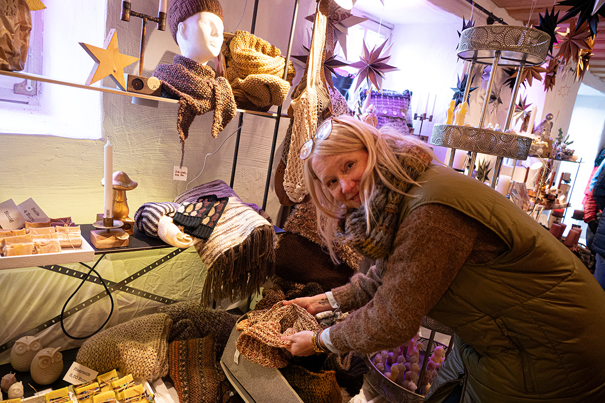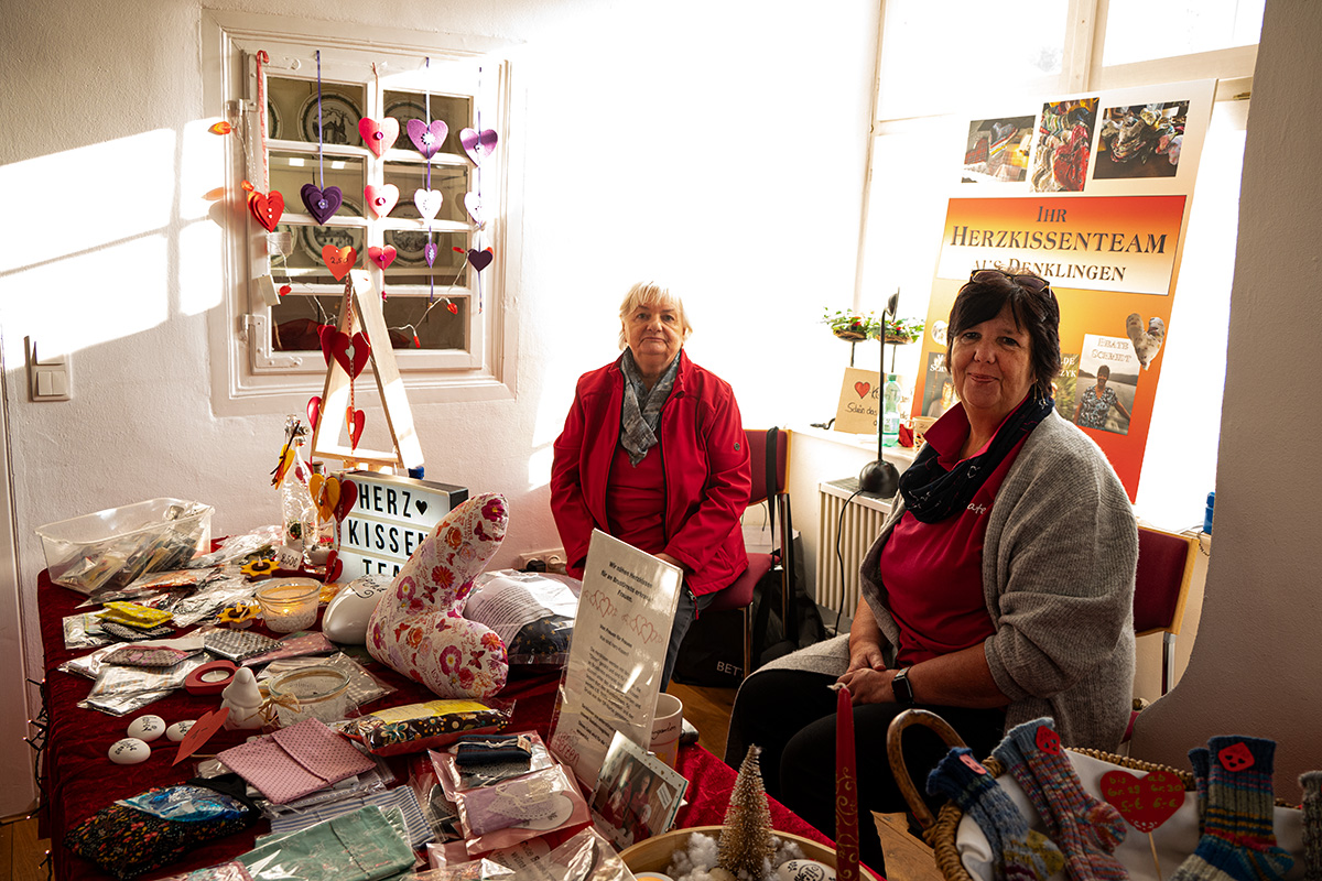 Zur Burgweihnacht im historischen Burghof Denklingen - bei klirrender Kälte, aber mit etwas Sonnenschein - hatte der örtliche Heimat- und Verschönerungsverein eingeladen. Viel Kreatives gab es hier, aber auch eine Adventsandacht und eine Weihnachtsliedersingen. In den Holzhütten und in der Burg präsentierten viele Aussteller selbstgefertigte Arbeiten. Wer für die Minusgrade draußen einen warmen Schal benötigte oder ein paar Stulpen, um die Hände beim Glühweinglas-Festhalten warmzuhalten, fand Angebote in mannigfaltiger und farbenfroher Auswahl. Die Brustkrebs-Selbsthilfegruppe „mamma CAMPY“ verkaufte Stirnbänder oder Armstulpen aus Walkwolle und informierte über ihre Arbeit. Herzkissen hatte das Herzkissen-Team aus Denklingen am Stand im warmen Burghaus. Die sind nicht nur schön anzusehen, sie lindern auch manchen Wundschmerz – und das Team verschenkt sie an Frauen, die an Brustkrebs erkrankt sind.
