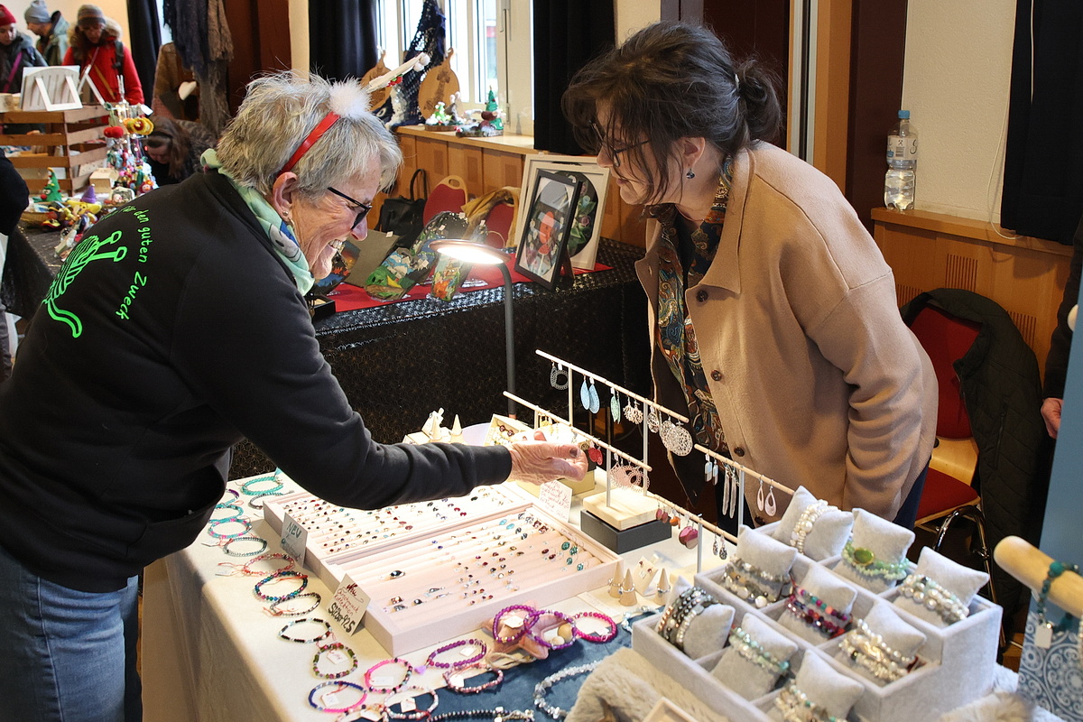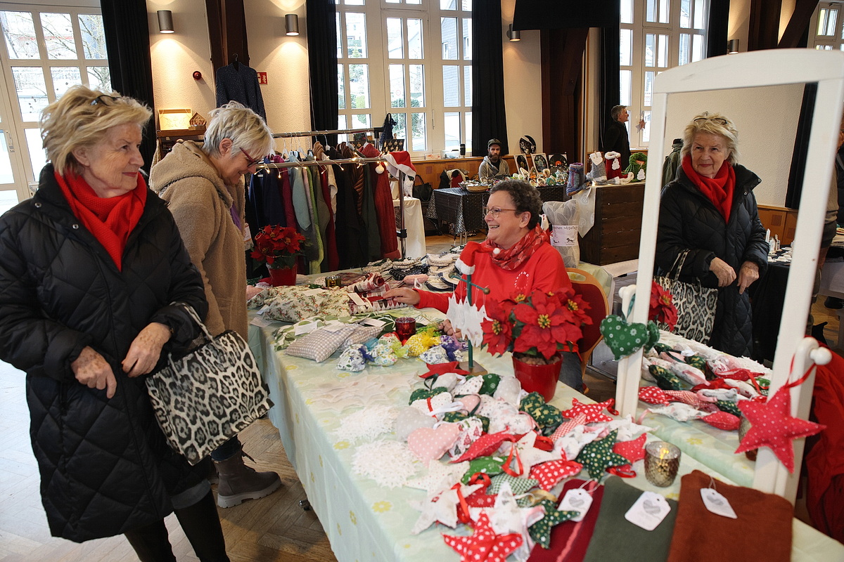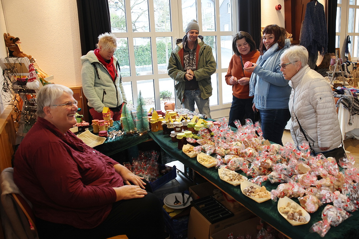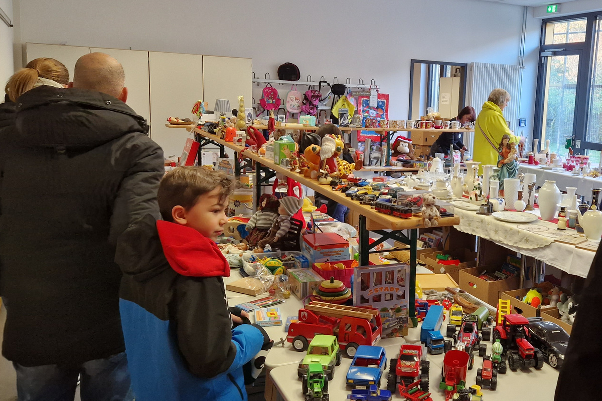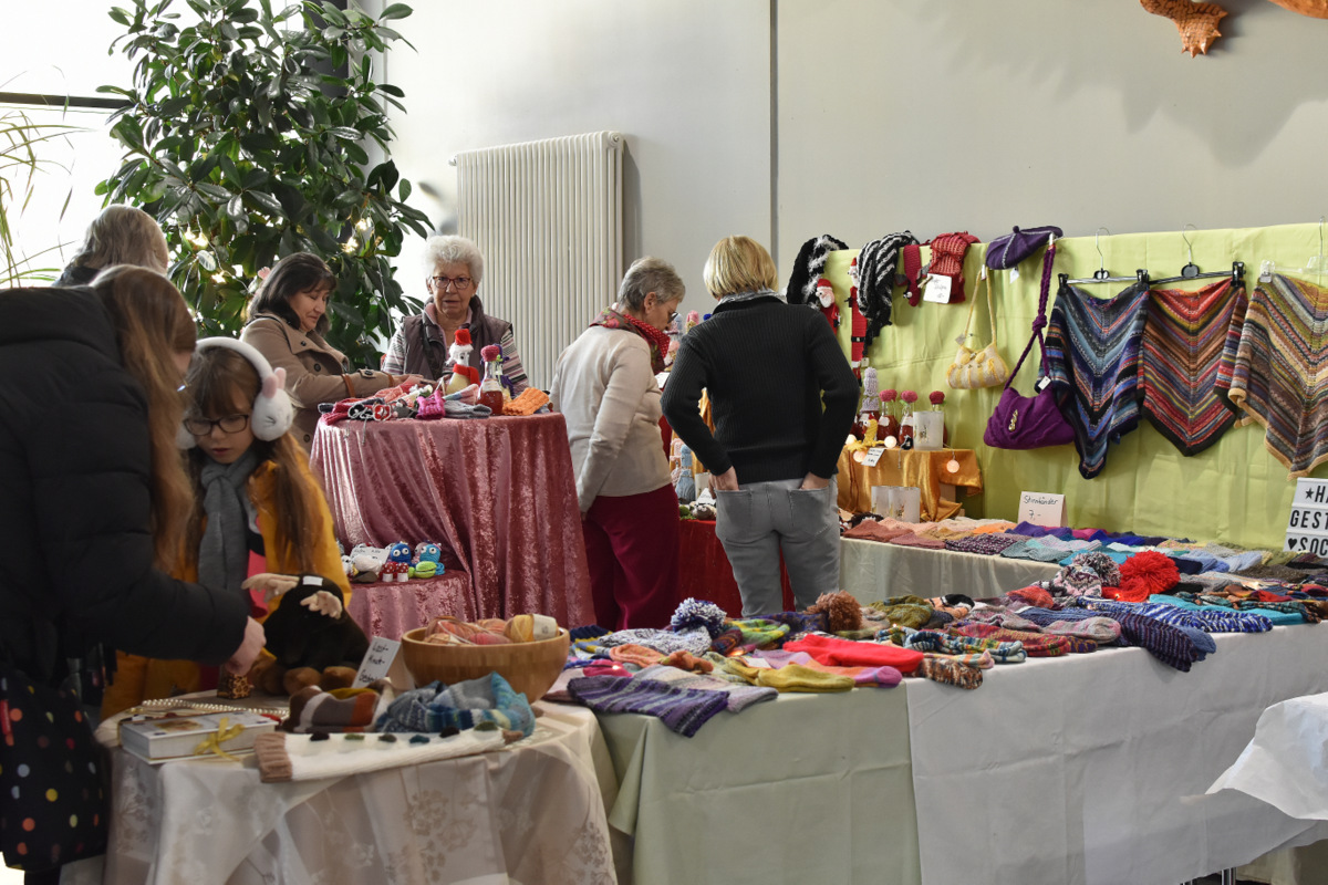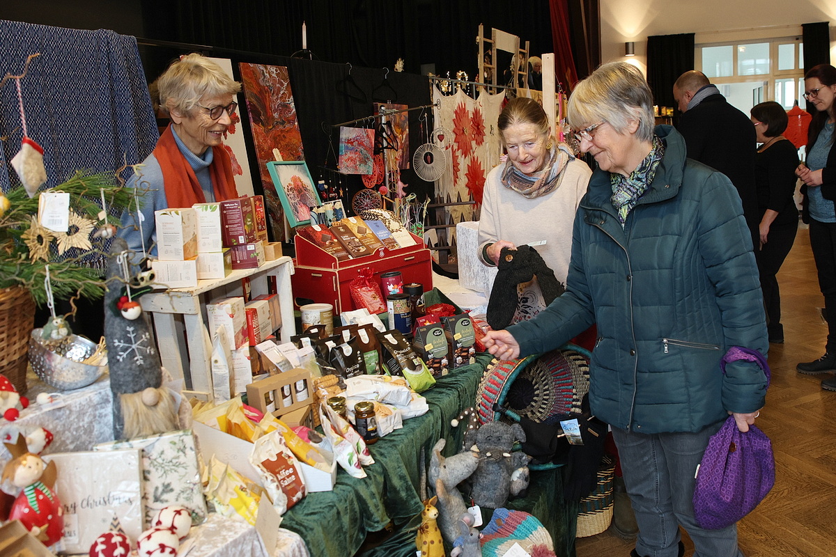 Die große Warenpalette reichte von Büchern zum Schmökern, gut erhaltener Second-Hand-Kleidung und hochwertigem Trödel über Spielzeug bis hin zu kunstgewerblichen Handarbeiten. Selbst gemachte Marmeladen, Liköre und andere Leckereien hatte Maria Schmidt im Angebot, die ihre „Zutaten“ für ihre Erzeugnisse eigenhändig sammelt. „Aktuell habe ich sogar veganen Kaviar hier stehen“, berichtete sie stolz. Holz- und Bastelarbeiten, Advents- und Weihnachtsschmuck, Puppenkleidung, Wollpantoffeln, Heim-Textilien, Fairtrade-Waren und die beliebte Tombola waren ebenfalls im Angebot. Mit Kaffee und Kuchen, Waffeln, Pizza und anderen Snacks wurde auch an die kleinen Gaumenfreuden gedacht. (mg)
