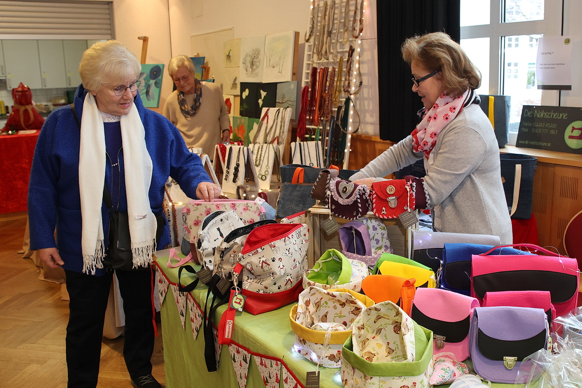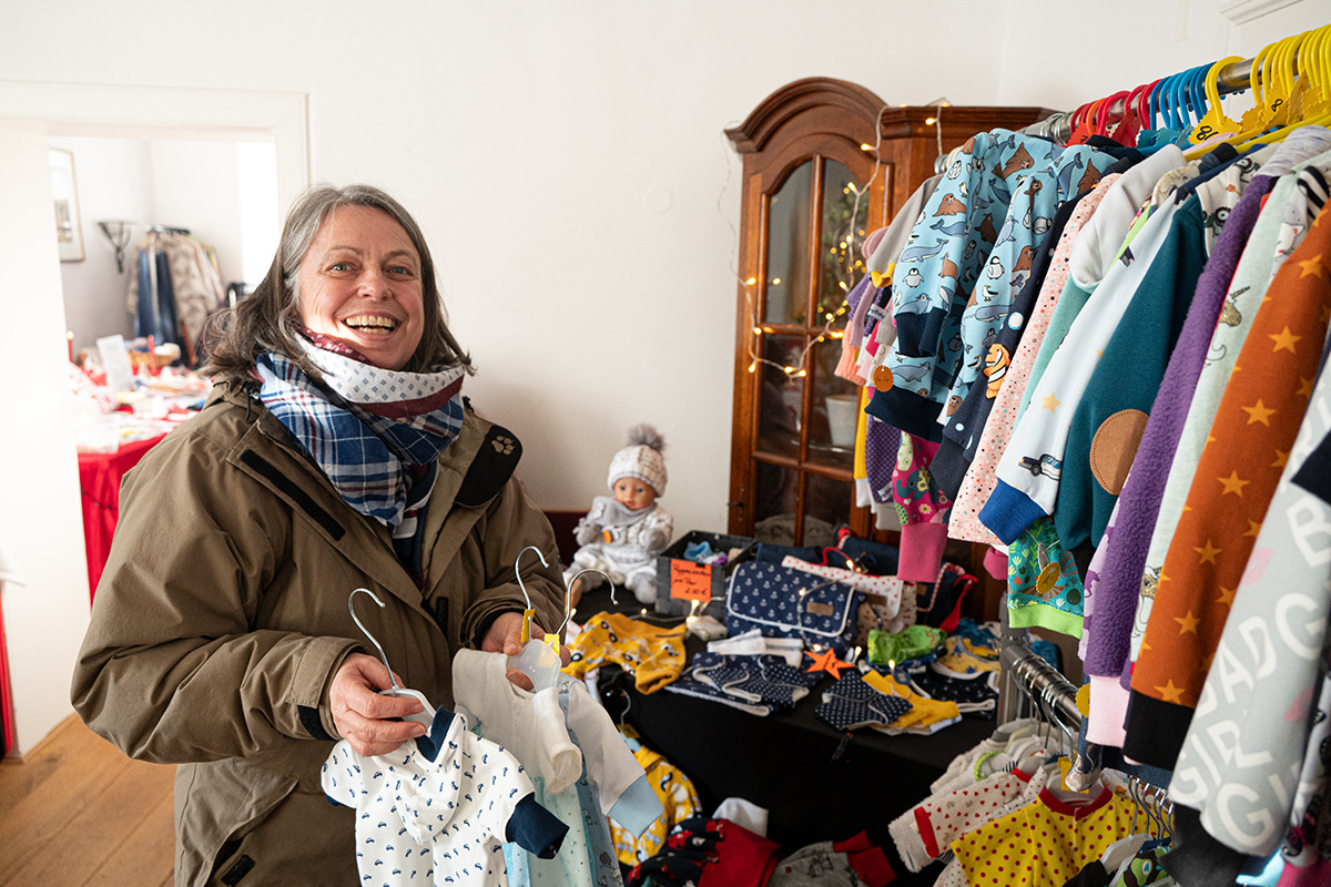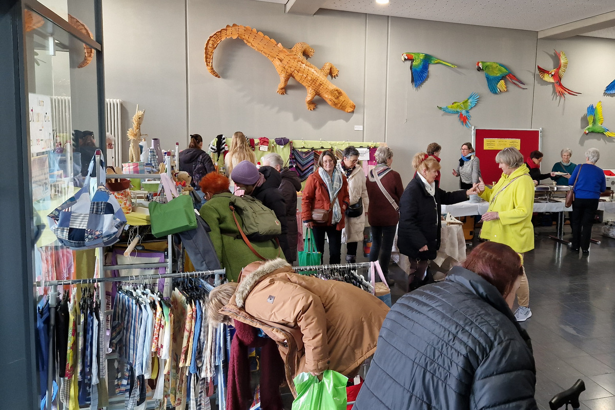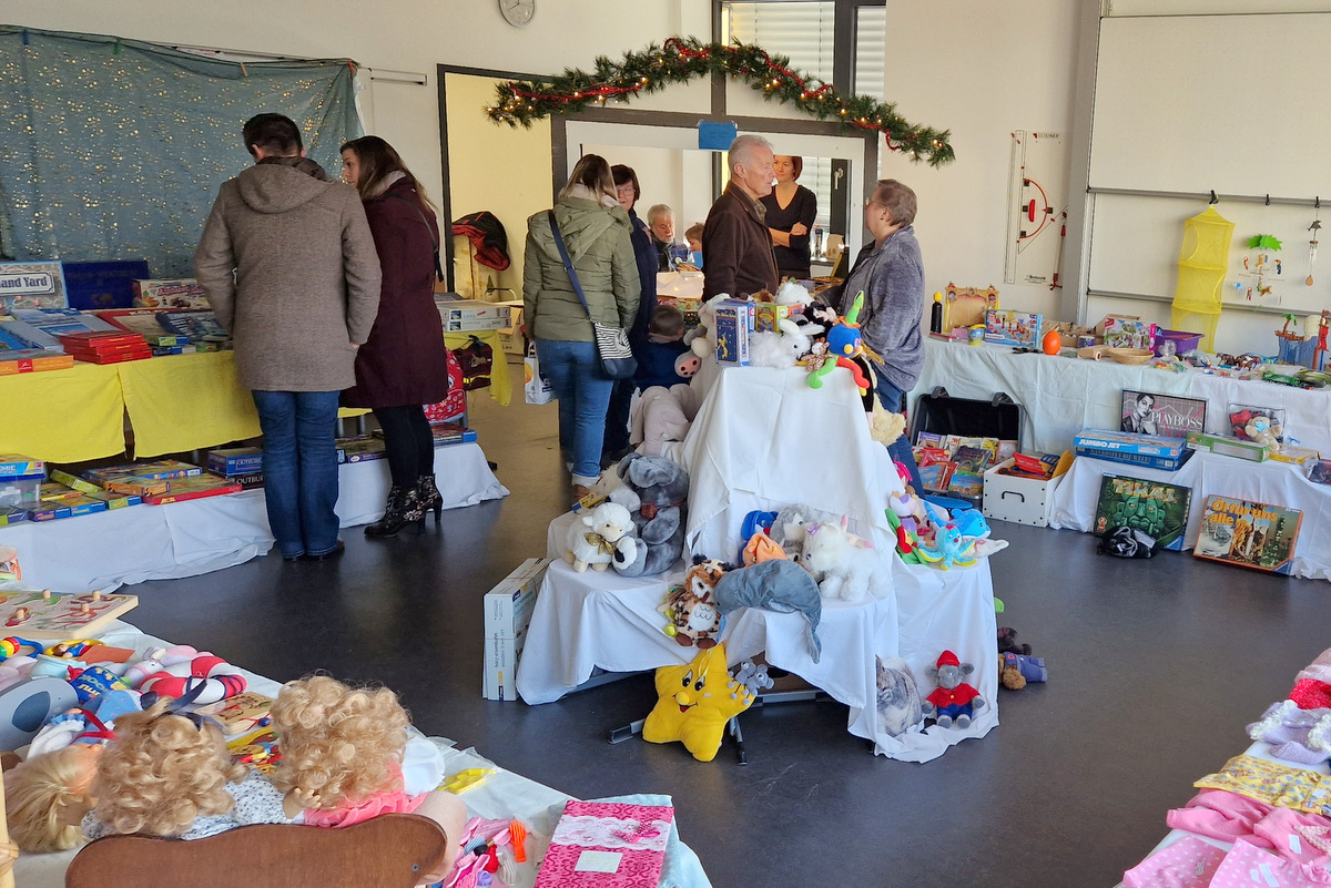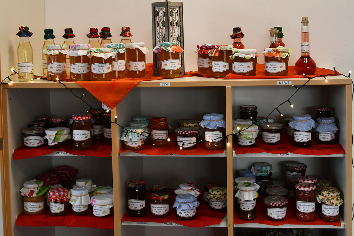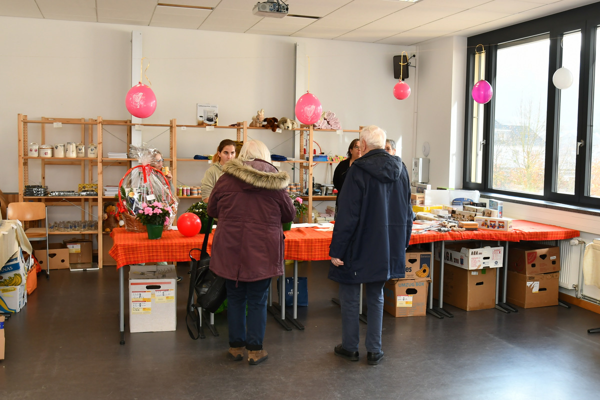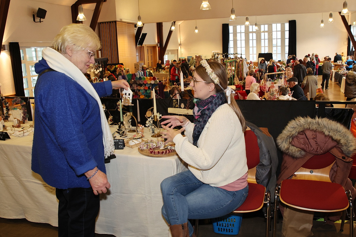 Die große Warenpalette reichte von Büchern zum Schmökern, gut erhaltener Second-Hand-Kleidung und hochwertigem Trödel über Spielzeug bis hin zu kunstgewerblichen Handarbeiten. Selbst gemachte Marmeladen, Liköre und andere Leckereien hatte Maria Schmidt im Angebot, die ihre „Zutaten“ für ihre Erzeugnisse eigenhändig sammelt. „Aktuell habe ich sogar veganen Kaviar hier stehen“, berichtete sie stolz. Holz- und Bastelarbeiten, Advents- und Weihnachtsschmuck, Puppenkleidung, Wollpantoffeln, Heim-Textilien, Fairtrade-Waren und die beliebte Tombola waren ebenfalls im Angebot. Mit Kaffee und Kuchen, Waffeln, Pizza und anderen Snacks wurde auch an die kleinen Gaumenfreuden gedacht. (mg)