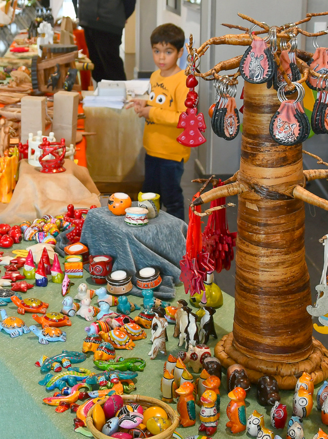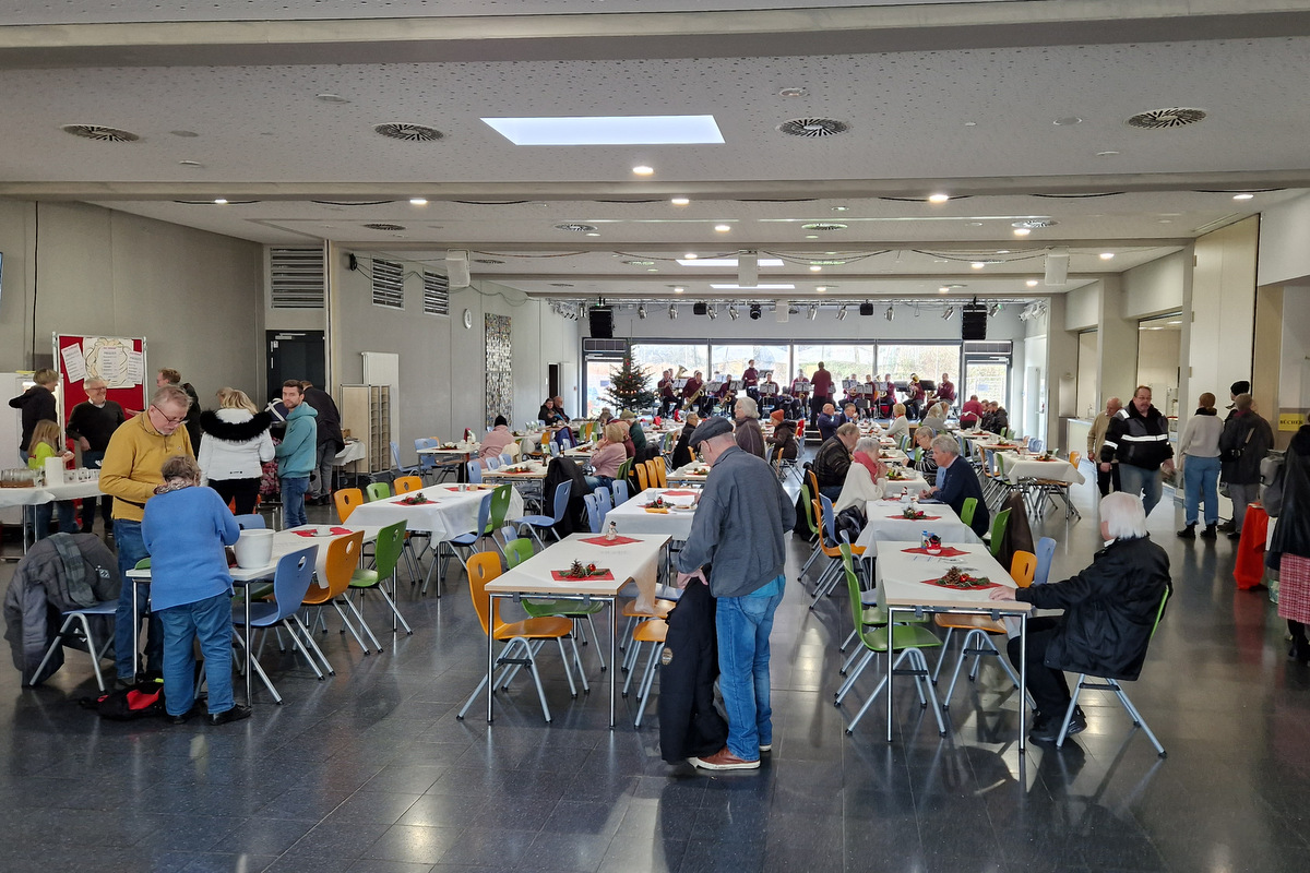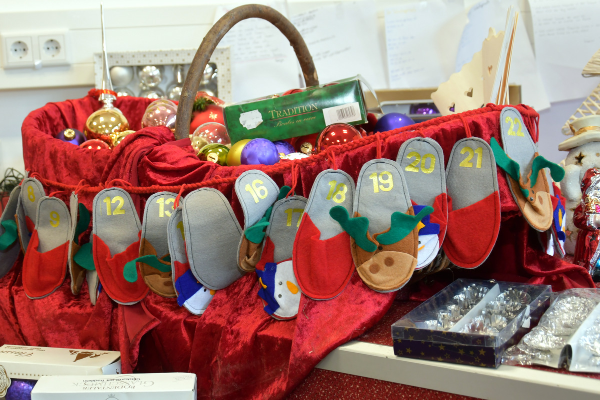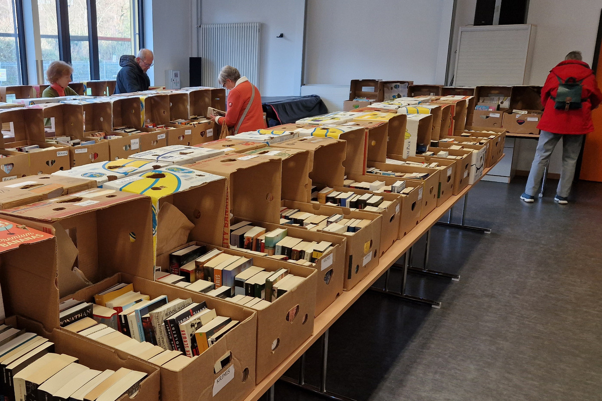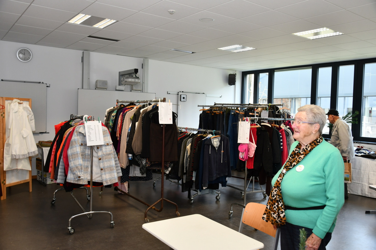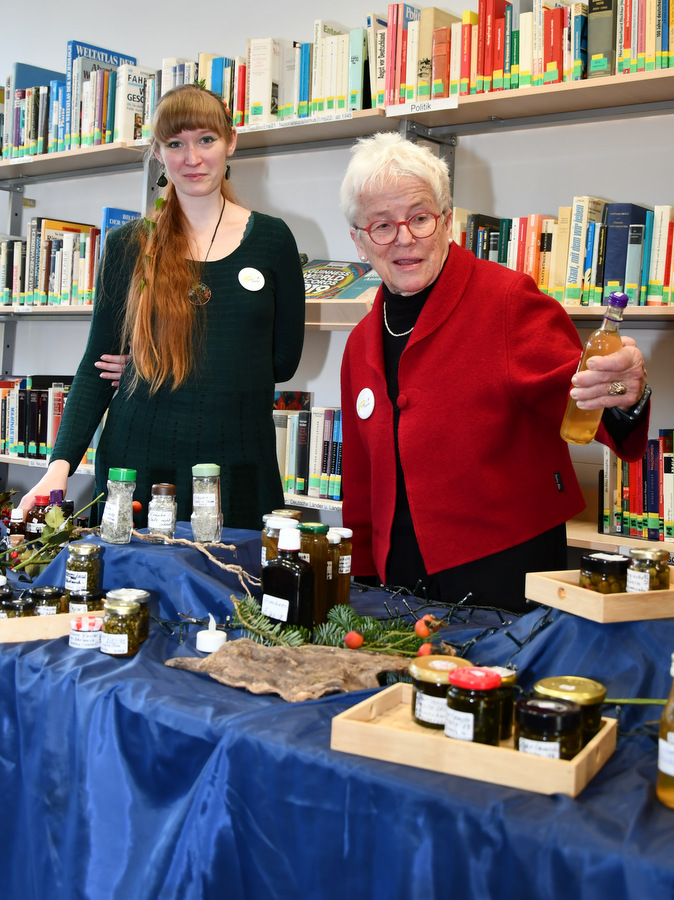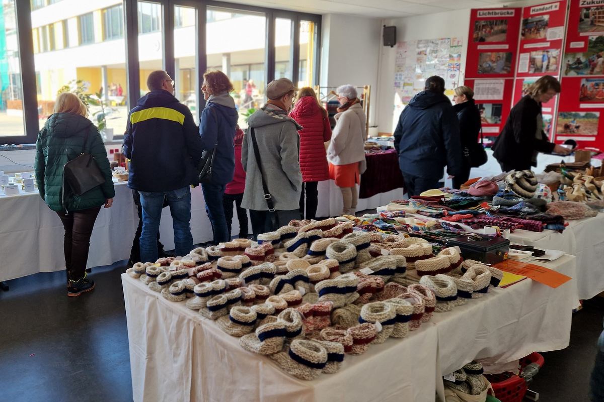 Die große Warenpalette reichte von Büchern zum Schmökern, gut erhaltener Second-Hand-Kleidung und hochwertigem Trödel über Spielzeug bis hin zu kunstgewerblichen Handarbeiten. Selbst gemachte Marmeladen, Liköre und andere Leckereien hatte Maria Schmidt im Angebot, die ihre „Zutaten“ für ihre Erzeugnisse eigenhändig sammelt. „Aktuell habe ich sogar veganen Kaviar hier stehen“, berichtete sie stolz. Holz- und Bastelarbeiten, Advents- und Weihnachtsschmuck, Puppenkleidung, Wollpantoffeln, Heim-Textilien, Fairtrade-Waren und die beliebte Tombola waren ebenfalls im Angebot. Mit Kaffee und Kuchen, Waffeln, Pizza und anderen Snacks wurde auch an die kleinen Gaumenfreuden gedacht. (mg)