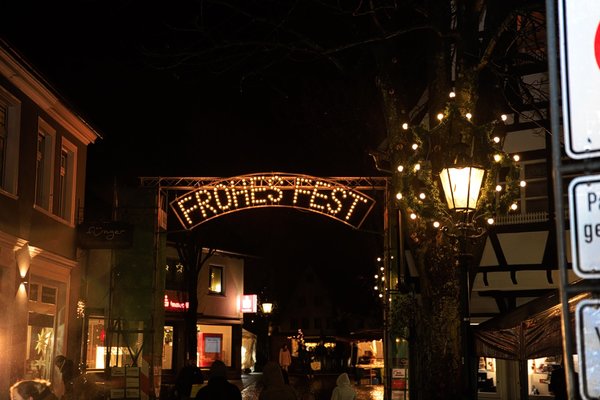 [Der „Frohes Fest “–Lichterbogen hängt wieder.]
