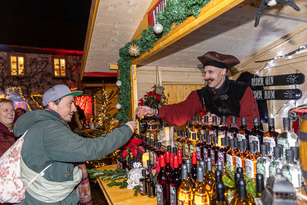 Mit 18 Ausstellern im Inneren der Burg und 17 vergebenen Outdoor-Weihnachtshütten stimmt der Heimat- und Verschönerungsverein (HVV) Denklingen die zahlreichen Besucher kulinarisch und stimmungsvoll auf die beginnende Vorweihnachtszeit ein. Silas Pröhl vom Freibeuterteam der „Sea of Spirits“ ist erstmalig mit einem Whisky Stand im historischen Innenhof der Burg zu finden. Normalerweise auf Mittelaltermärkten unterwegs, bietet er zum allerersten Mal auf einem Weihnachtsmarkt seine Getränkevariationen aus den Bereichen Whisky, Gin und Rum zur Verkostung und zum Kauf an. Gemeinsam mit drei weiteren Freibeutern füllt der Mannheimer die edlen Tropfen ab und veredelt sie mit Karamell, Beeren oder gar Weihnachtsgewürzen.