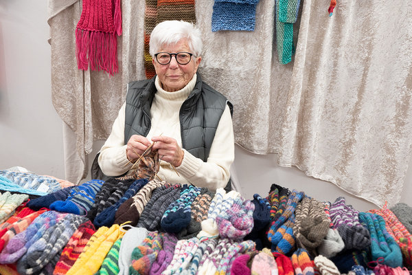 [Der Erlös aus dem Verkauf von Edith Kösters Strickwaren geht an die Wiehler Vereine HBW (Heimat, Begleiten, Wohnen Gmbh Wiehl), Tafel und Lebensfarben. Also bekommt man bei hier nicht nur warme Füße, sondern tut auch noch was Gutes.]